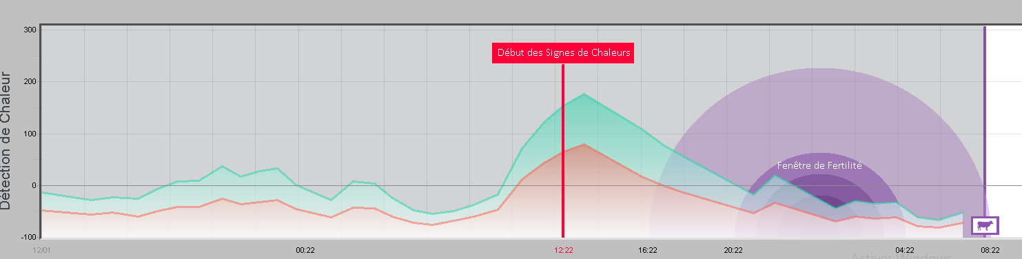 La détection de suractivité avec les podomètres étant plus précoce que l’oeil humain, le début des chaleurs est correctement détecté et l’insémination optimale intervient autour de 18 heures après le début des chaleurs (graphique ci-dessous).