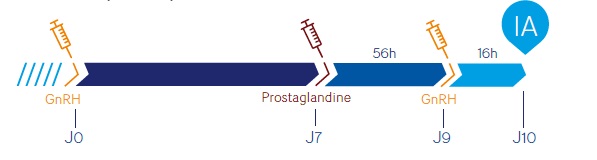 Le plus couramment utilisé sur animal cyclé est un protocole OvSynch (GPG) (commencé le mardi lors de la visite vétérinaire pour une IA le vendredi de la semaine suivante).