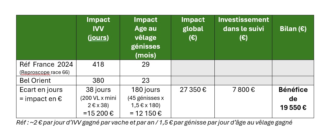 En comparaison aux moyennes nationales (418 jours d’IVV et 29 mois d’âge au vêlage- source Reproscope), le gain est évalué à (tableau ci-dessous)