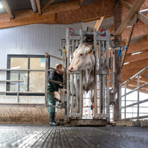 Le jour du tarissement, nous réalisons un parage d’entretien (pour que l’animal profite pleinement de son repos), les vaccinations nécessaires (exemple : contre les diarrhées néonatales) ainsi qu’une évaluation de l’état d’engraissement (NEC). L’idée est de pouvoir vérifier l’évolution de l’état d’engraissement pendant le tarissement (maintien voire légère augmentation).