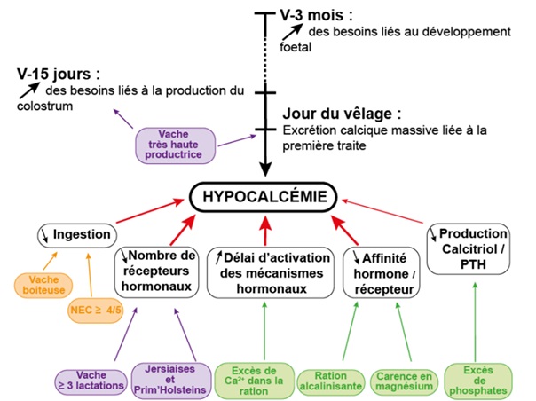 Associée à beaucoup d’autres troubles du péri-partum (rétentions, vêlages difficiles, mammites, cétose,…), la calcémie est un point clé à gérer pendant le tarissement avant que les mobilisations ne soient trop fortes.