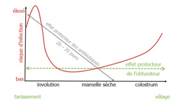 Le graphique ci-dessous issu des travaux de Bradley et al montre l’importance de soigner les vaches infectées pendant la période sèche mais aussi de protéger les nouvelles infections en fin de tarissement avec un obturateur, à un moment où très peu d’antibiotiques couvrent le risque d’infection notamment lié aux germes d’environnement tels que E.Coli .