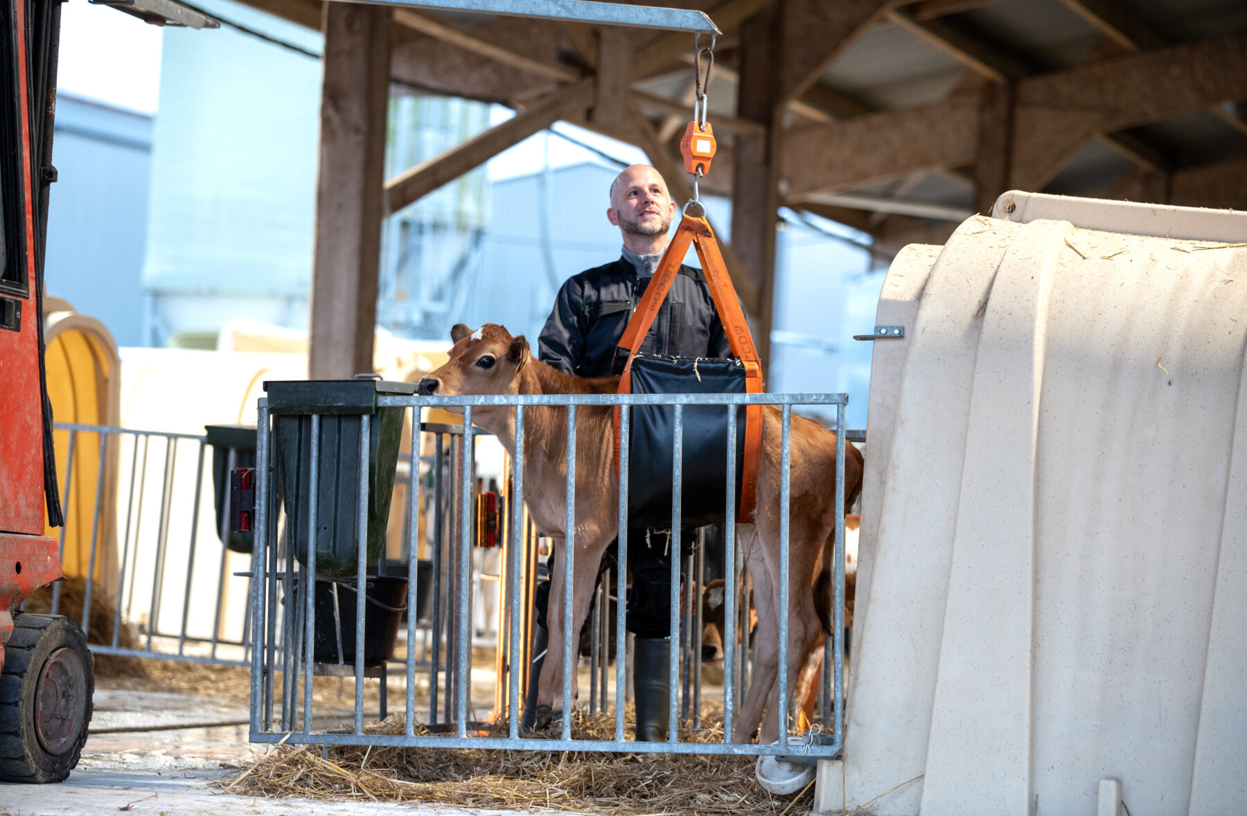 - Les veaux sont pesés toutes les semaines grâce à un harnais, relié à un peson adapté sur un chariot élévateur. Ce rythme est utile pour le suivi des essais sur les veaux mais également pour le suivi des performances de l’élevage