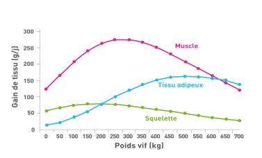 Comme le montre les courbes ci-dessous, faire le maximum de croissance avant 6 mois est profitable pour la constitution de tissus fonctionnels comme les muscles et le squelette sans risque de dépôts de gras excessifs.